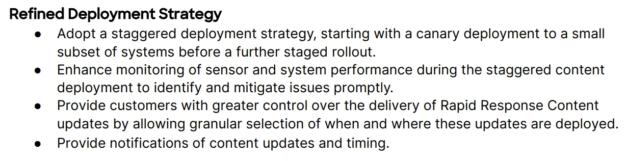 Software, distributed systems, and an adversarial game make for a tough playing field, but this didn’t have to happen. Staged rollouts and continuous integration have been used for decades to reduce risk. This public postmortem from a cybersecurity company with this much responsibility on 2024 is shameful:
