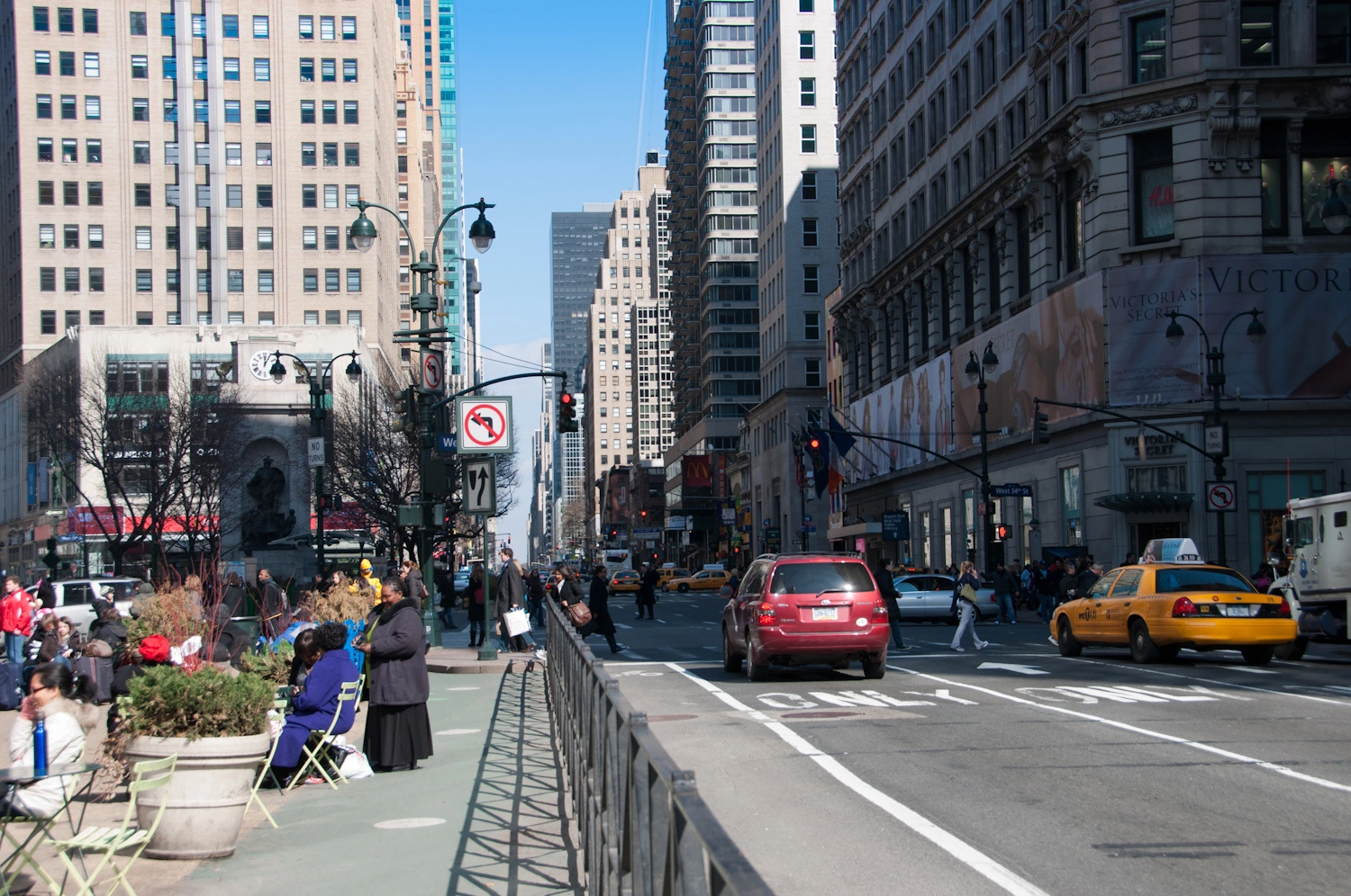 Such street layout along with the flatness of Manhattan helps reducing the claustrophobic feeling of feeling surrounded by skyscrapers as your eyes get lost in the distance in both ends of most of the streets.
