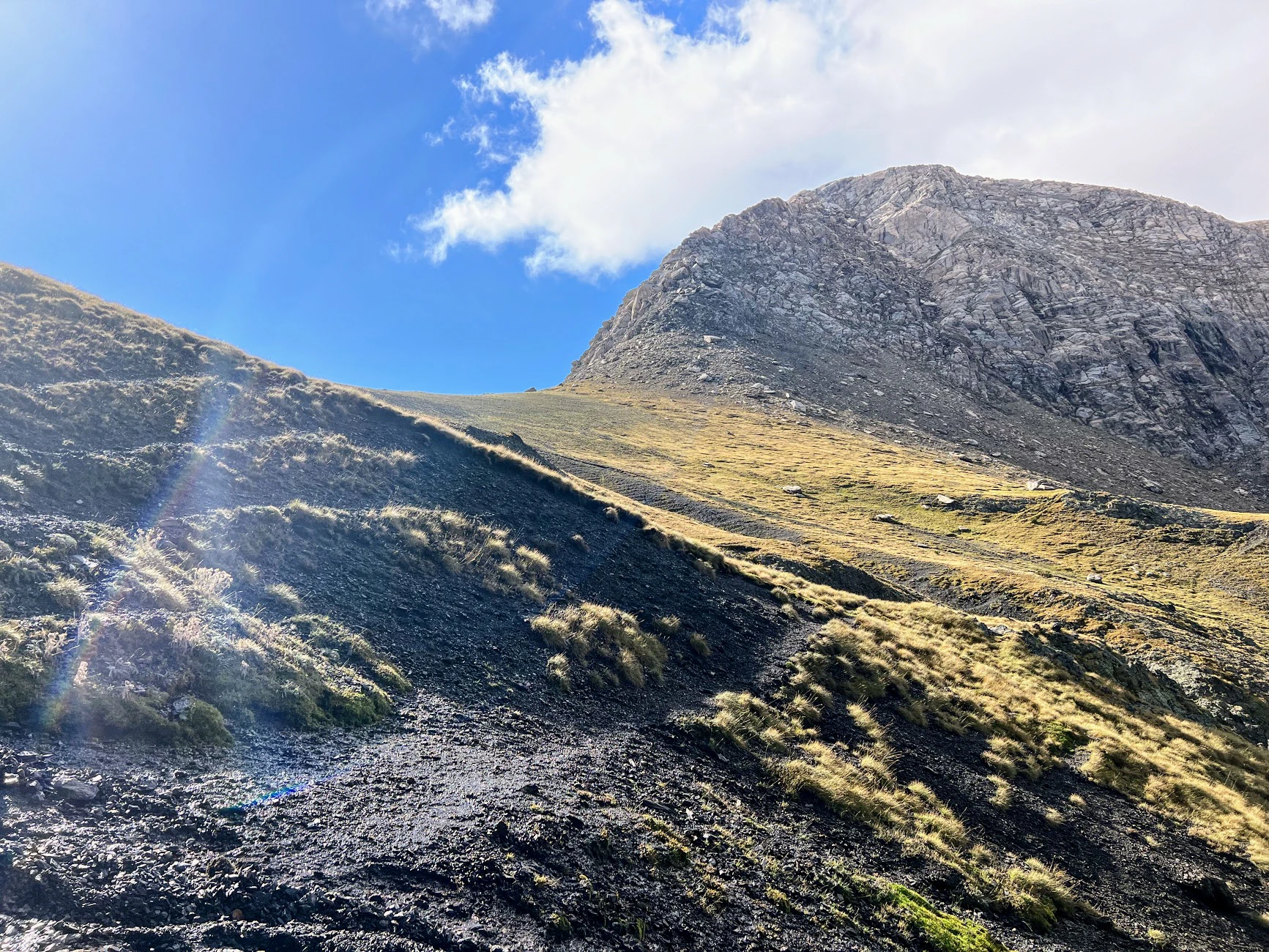 At around 10:20, we reached Coll d’Arenes, and a few minutes later, the sun finally rose beyond the mountains bathing the spectacular landscape of black sand 1 and yellow grass around us with light. We explored an area near the pass where tiny water streams seeped from the ground and merged into the Ríu de l’Ensegur. I had never seen anything like that; I thought rivers were always born above ground. Following my friend’s lead, I drank from it. It tasted metallic, but my mind reassured me that it was pure and healthy mineral water.