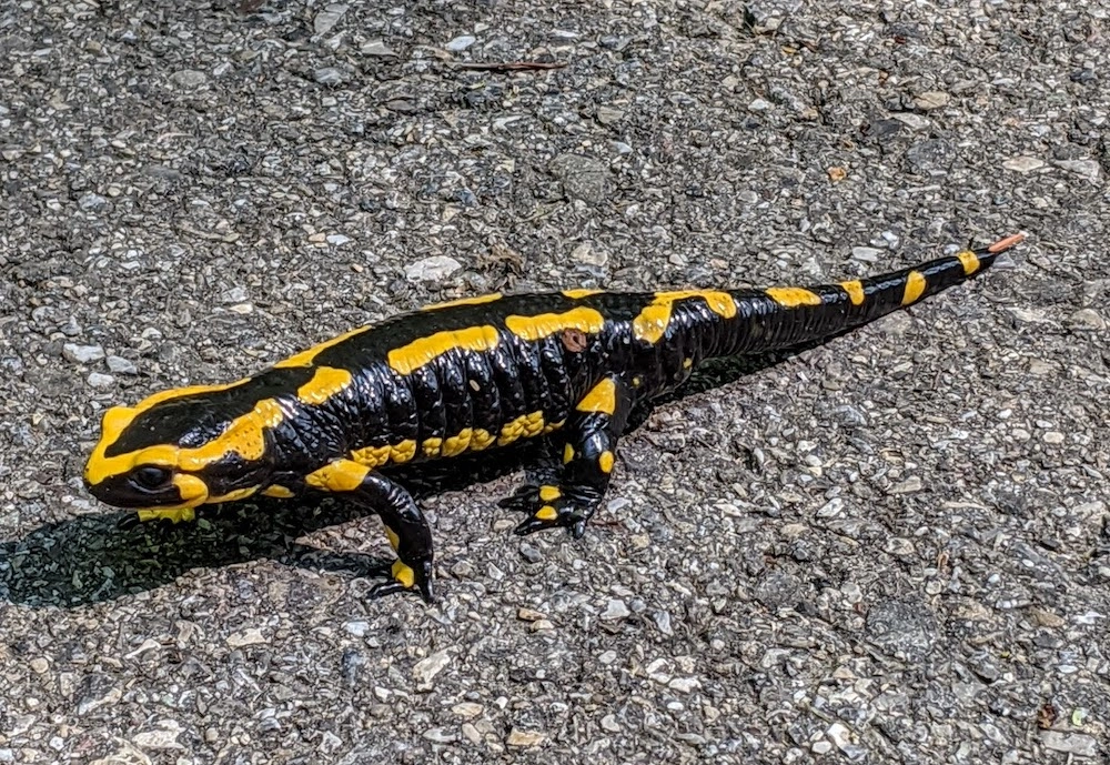 We saw a fire salamander and a slowworm for the first time. We noticed plants that must have been there all the time but that we had never noticed before, like horsetails, yellow archangels, herb Robert, carpet bugle, red clover, guelder rose, field scabious, wintercresses, onobrychis, bird’s-foot trefoil and hawksbeard. And we also explored a somewhat hidden meadow that a friendly dad told us about in a previous hike.
