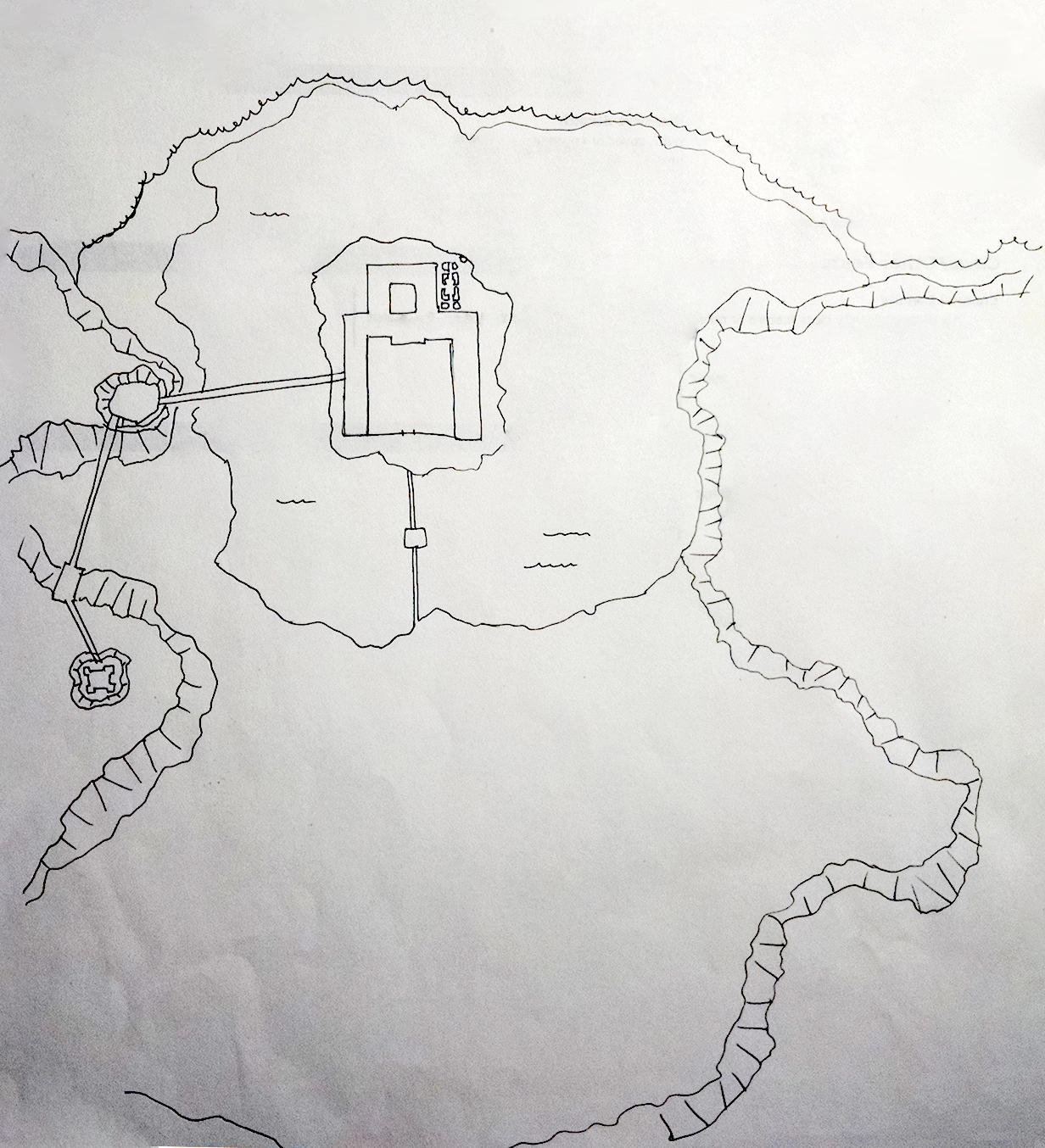 When they reach the ruined structure they find the halflings, still with their loot on, rotting away in the ruins. After taking care of the indecorous loot issue the group discovers a cave inside the cellar that leads them to the Shadowfell, a plane of necrotic energy and a sinister mirror of the material plane. The cave portal opens up to a valley holding an abandoned city, a dark lake and a palace. Tall peaks and two towers connected with an aqueduct flank the west side of the valley.
