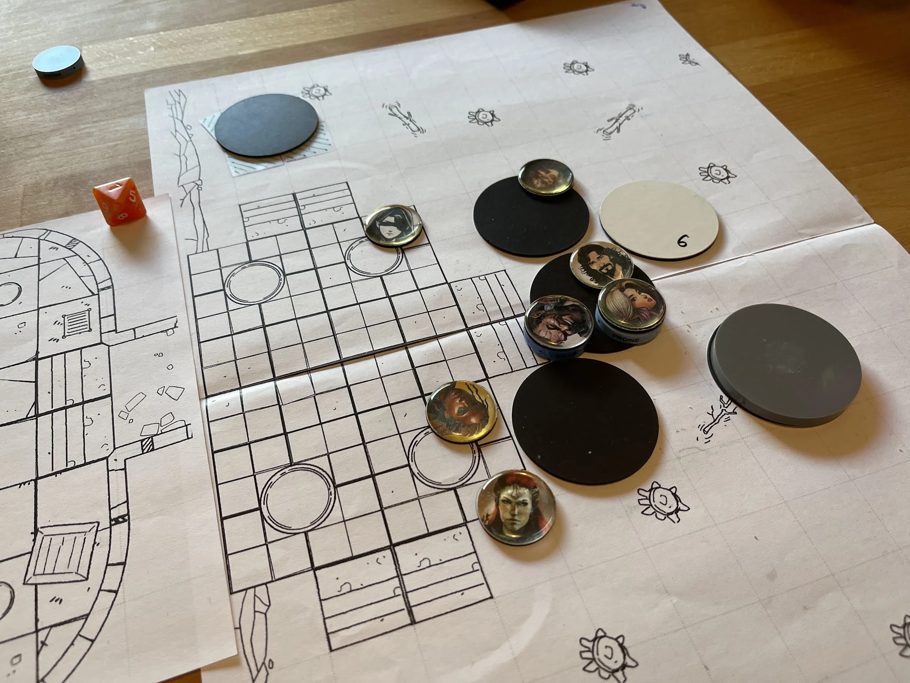 The heroes enter the dungeon once again, but this time they crawl over the bridge, and they find the mark on the door that Avilos had left the night before. The session ends with the group in position and Sophi using mage hand to open the door’s handle.
