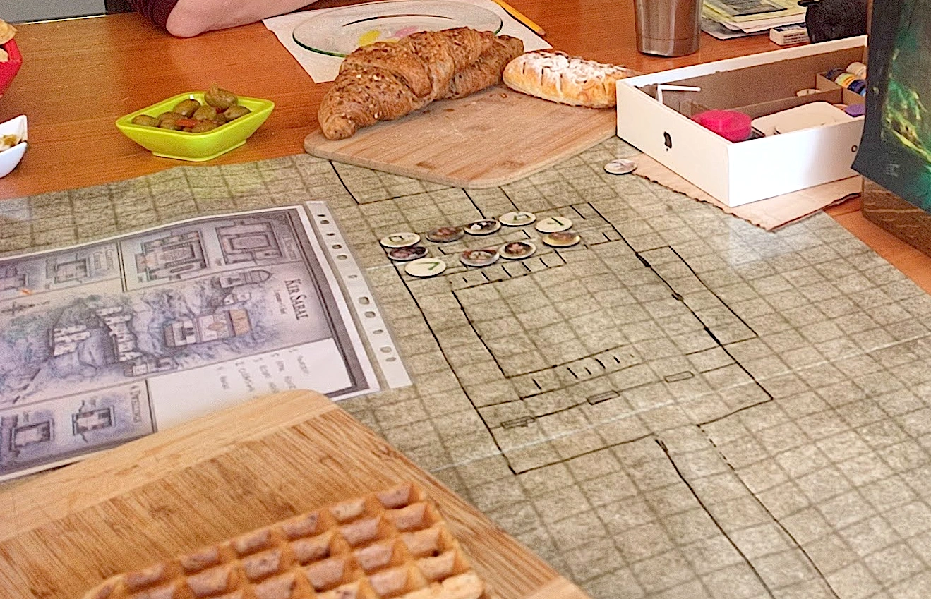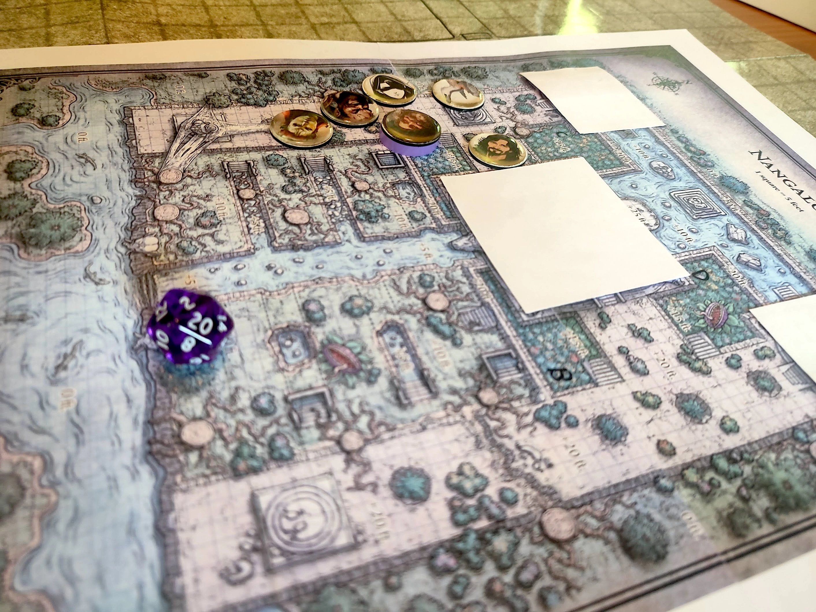 The next day the party takes to the air again and by noon they arrive close enough to Nangalore where they part ways with Skydancer and company. After a short walk, they arrive at the flooded area surrounding the palace. Ellie casts Pass Without Trace on the whole party, and thanks to that they spot and avoid a bunch of crocodiles at the front of the palace. The heroes enter the palace by climbing its Western wall instead, but not before a couple of failed attempts where it looked as if the twenty-foot-high wall would defeat the level five party.