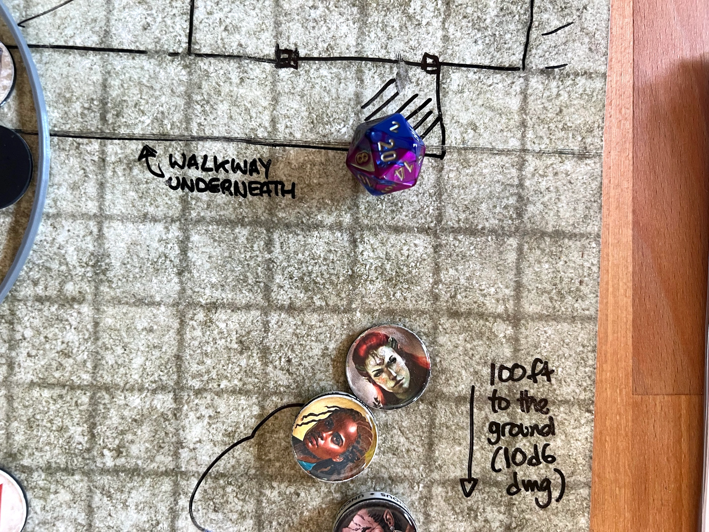 Avilos’s tactic for the fight is to combine his Hold Person spell and gravity to turn the gargoyles temporarily unable to fly and make them crash-land. He combines that with Thunderwave, which is also Ellie’s main weapon during the fight. Sophi climbs to the monastery’s top floor early on and spends the battle peppering gargoyles with arrows, and Chos invokes a cloud of phantasmal spirit guardians that get through the stony skin of the gargoyles as if they were made of cheese and spends most of the battle sweeping the walkways.