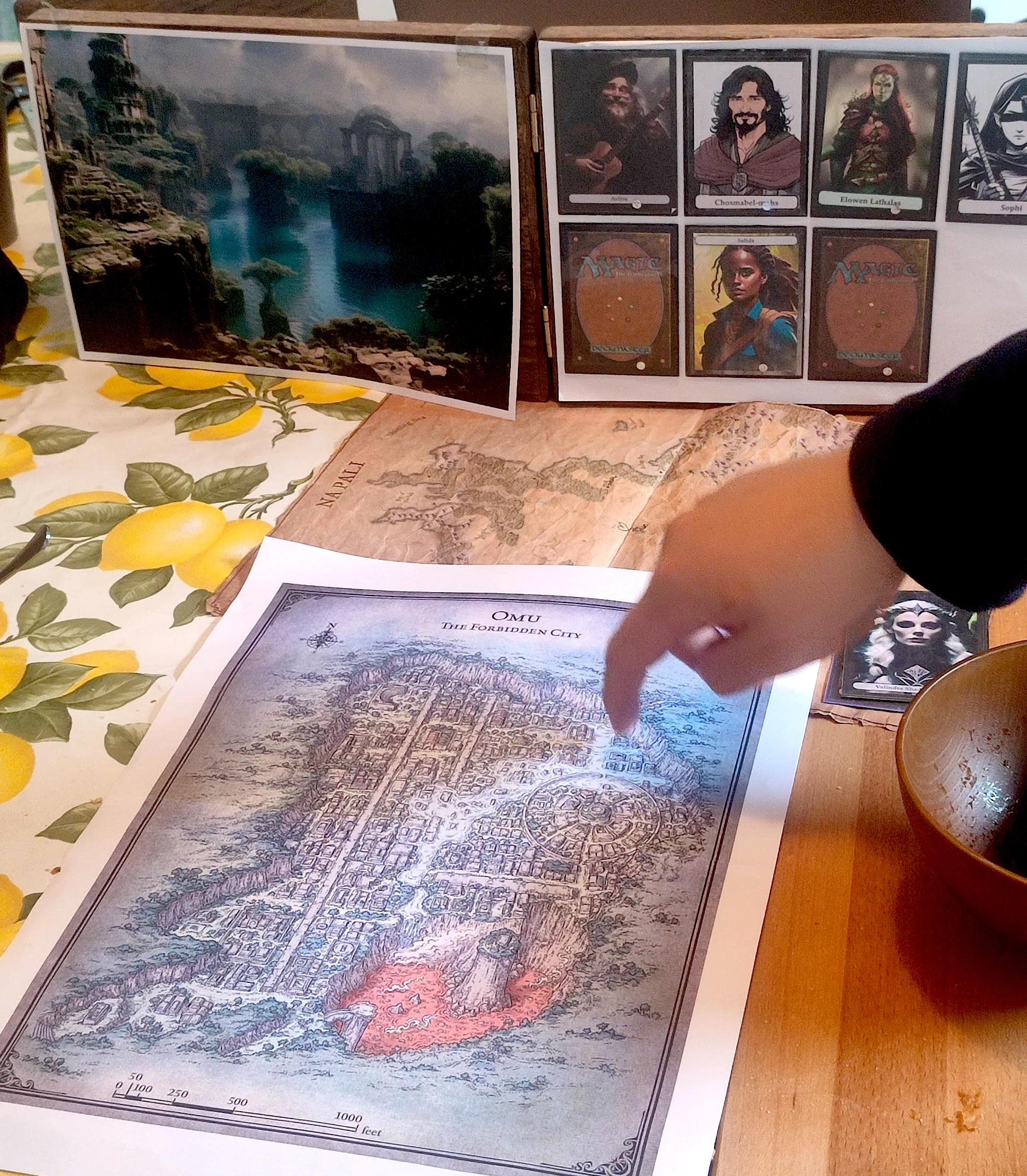 The party camps on top of the tall cliffs that surround the city, monitor it until dinner and, the next morning, they carefully descend the cliffs and enter it.