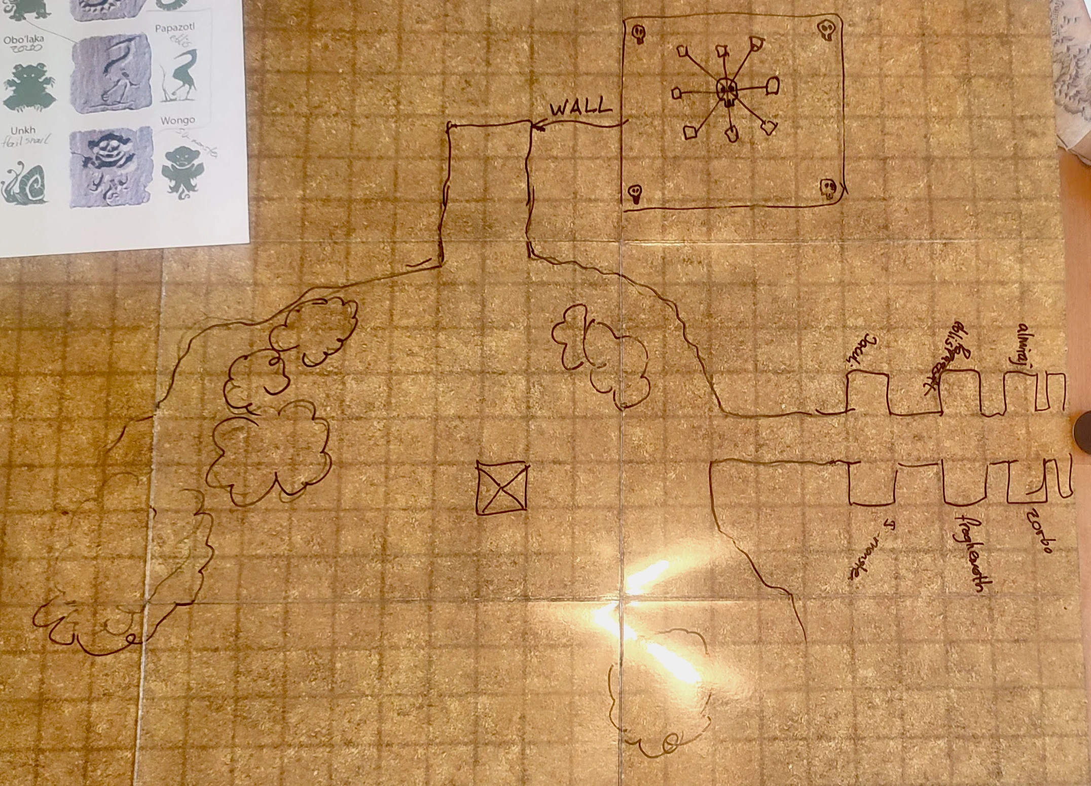 The next morning, the party heads to the nearest shrine, Kubazan’s. When they arrive, they see a large and muddy pool with a large froghemoth statue and, beyond it, a vine-covered shrine.