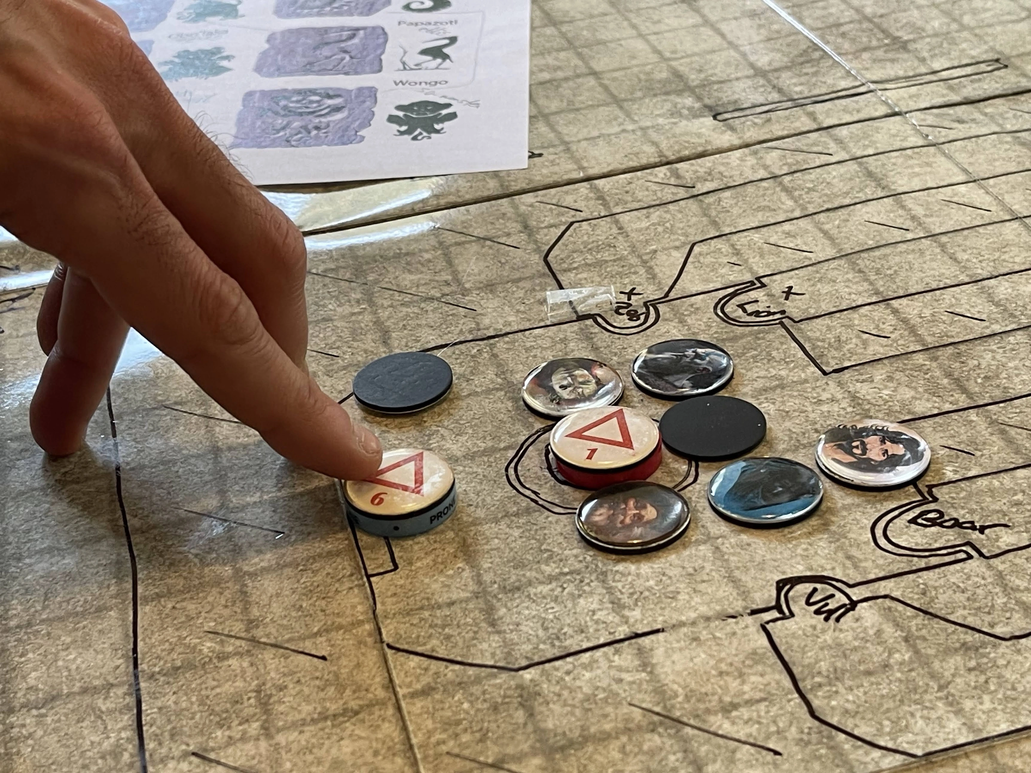 When they arrive, they find a shrine with five entrance corridors that lead inside. Four of the corridors lead to walls where carved masks let them peer into the central room. Around the masks they find cryptic messages. The central corridor leads into the main room where a large statue of Wongo stands. The statue has cupped feet and hands. Behind the statue, they see a relief where Wongo is fighting another creature. After much deliberation, the heroes figure out the logic puzzle and pour water onto the left cupped hand of Wongo’s statue. As soon as they do that, a cube appears on top of the statue along with 4 su-monsters who start attacking the heroes. The heroes, though, make quick work of them with Krariak dealing the killing blow to three of them.