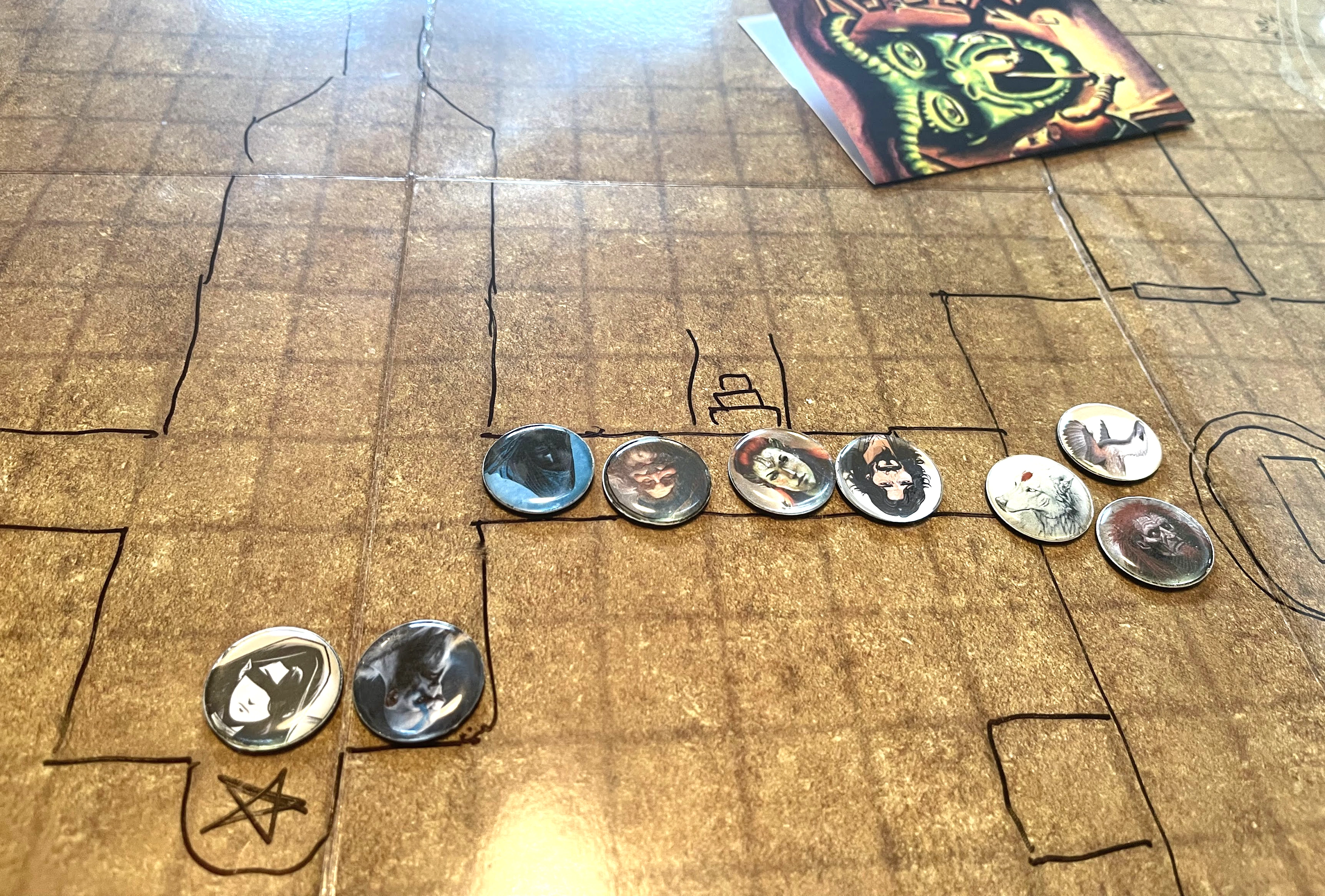 Upstairs, the rest of the party inspects the devil face wall relief. Sophi casts Mage Hand and tries to find out what’s inside the magical darkness, but she can’t tell much due to the Mage Hand’s limitations. Avilos casts mage hand too and brings it inside with a lit torch, but when he takes it out, the torch has been split into two.