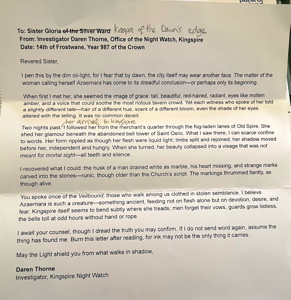 Putting all together, the group decides to go see Sister Gloria the next day and tell her what they found, betraying their pretty patron, Azaernara.